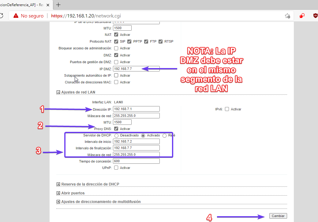 - IP de la DMZ: 192.168.7.7. Debe ser la IP del puerto WAN del equipo TP-LINK