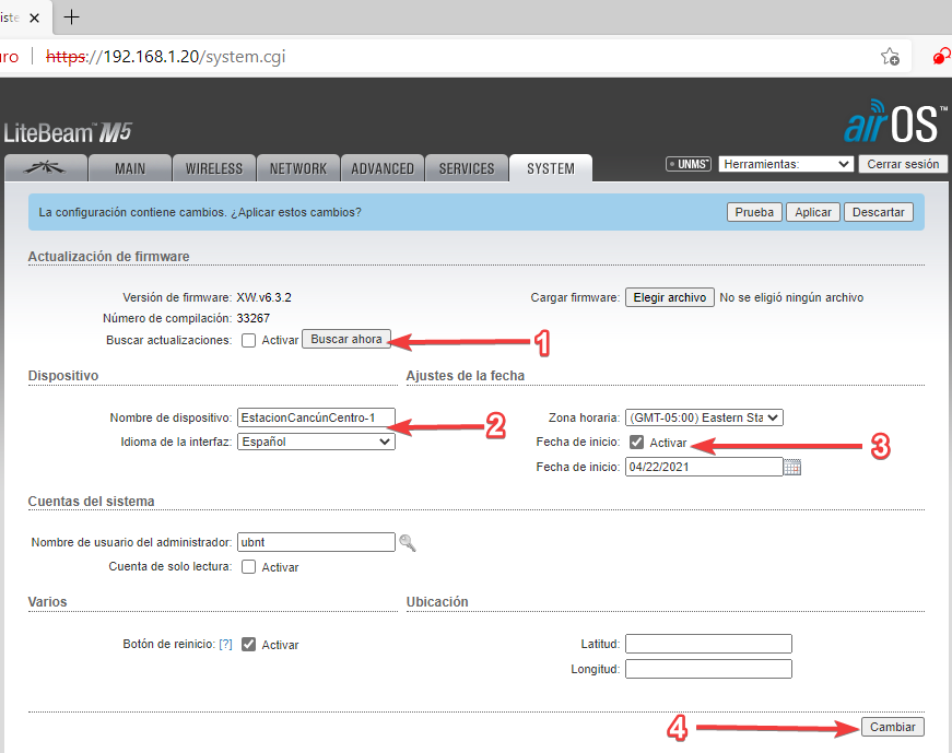 - La contraseña actual es la misma con que iniciamos sesión: “ubnt”