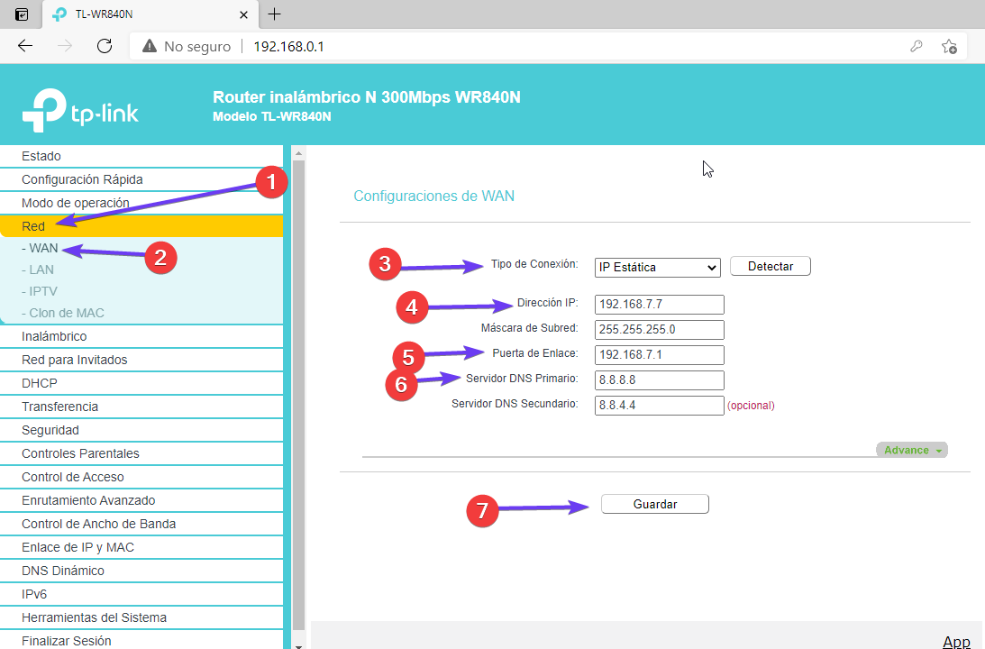 - Dirección IP: 192.168.7.1. Esta será la nueva IP de la interfaz LAN. Reemplazará la 192.168.1.20.