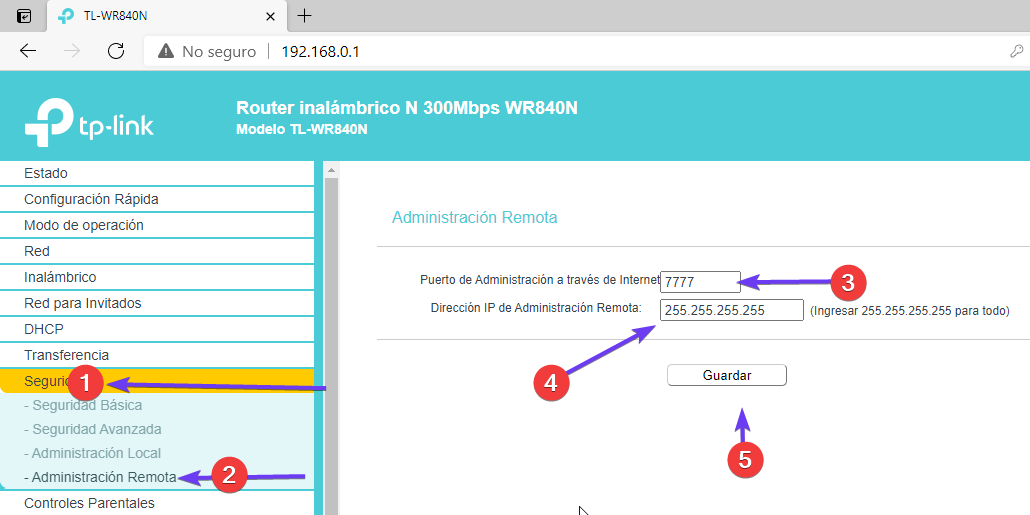 Es importante recordar ese puerto para poder acceder al equipo - Dirección IP de Administración Remota: Escribimos 255.255.255.55 para permitir que cualquier dirección pueda acceder al TP-LINK.