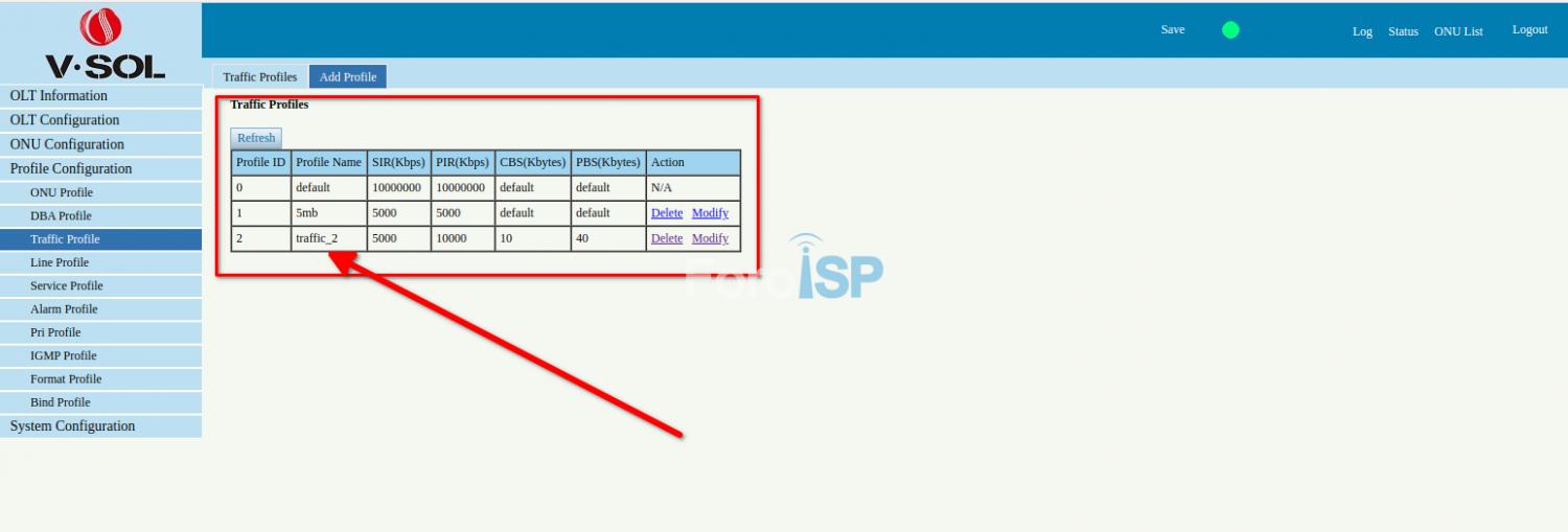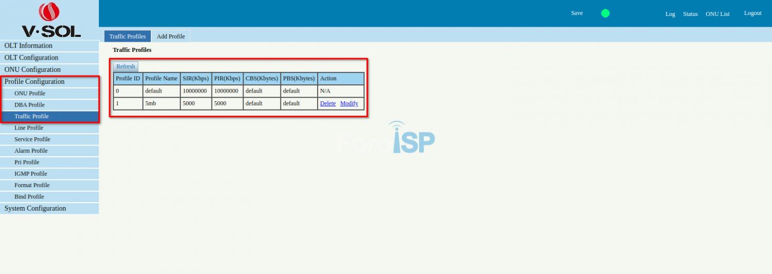 Podemos crear perfiles de velocidad (Traffic Profiles), en la sección Traffic Profile del menú Profile Configuration. Los perfiles de velocidad nos sirven para limitar el ancho de banda (Subida/Bajada) de una ONU autorizada a la que se le apliquen estas configuraciones. Esta limitación la realiza la OLT y está estructurada de la siguiente manera.