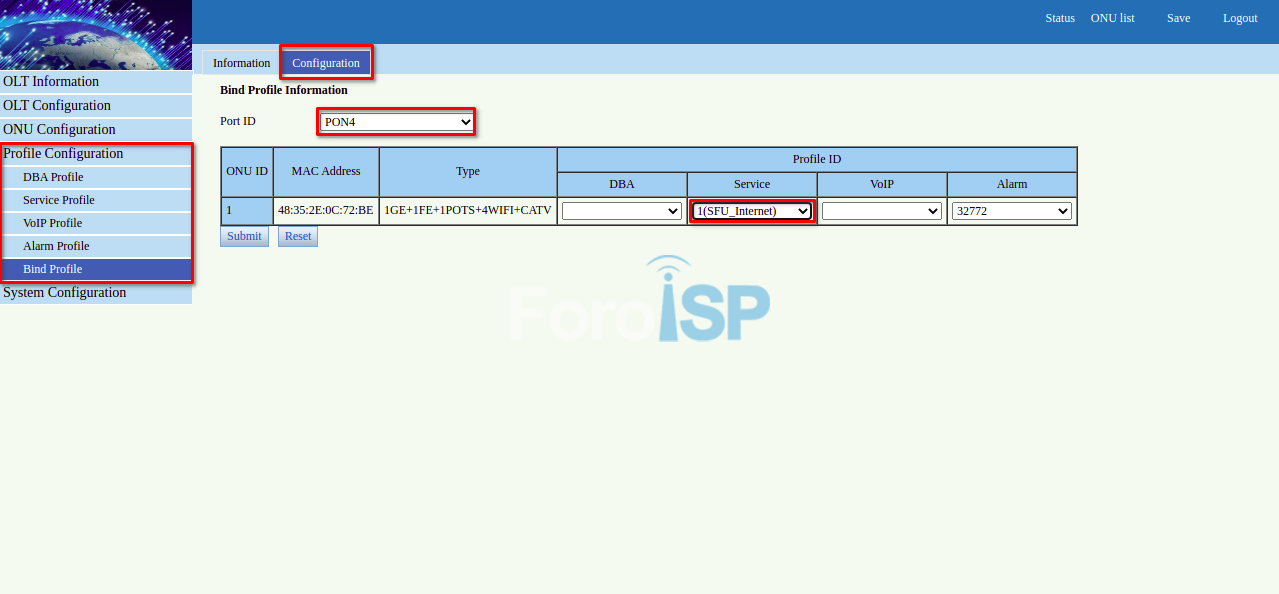 Para asociar el Service Profile creado a nuestra ONU podemos hacerlo desde: