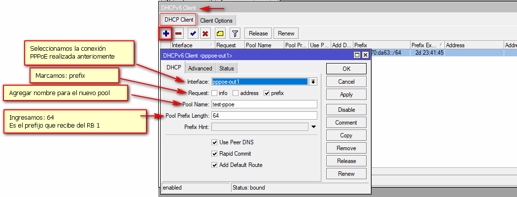 Ir IPv6->DHCP Client -> Agregar nuevo [+]
