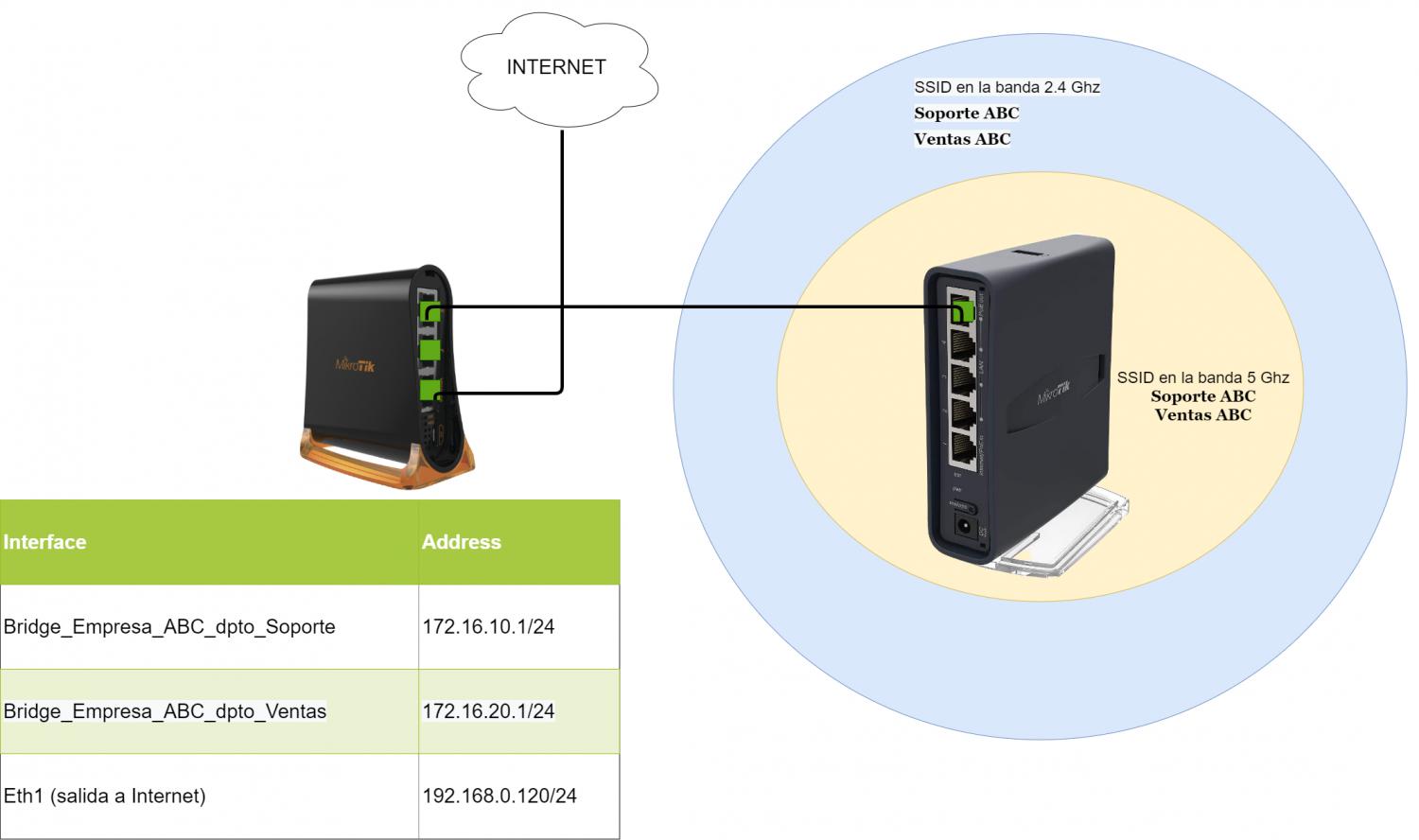 En esta práctica configuraremos 2 SSID con redes diferentes. Ambos SSID deberán transmitirse en las bandas 2.4Ghz y 5Ghz. Los clientes serán capaces de cambiar de banda según la distancia al AP y además serán capaces de caminar de un lado donde haya un AP cercano y se conectarán a este mismo, sin siquiera percatarse del cambio (roamming).