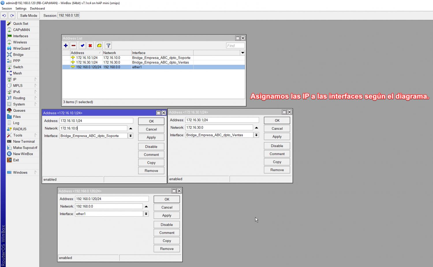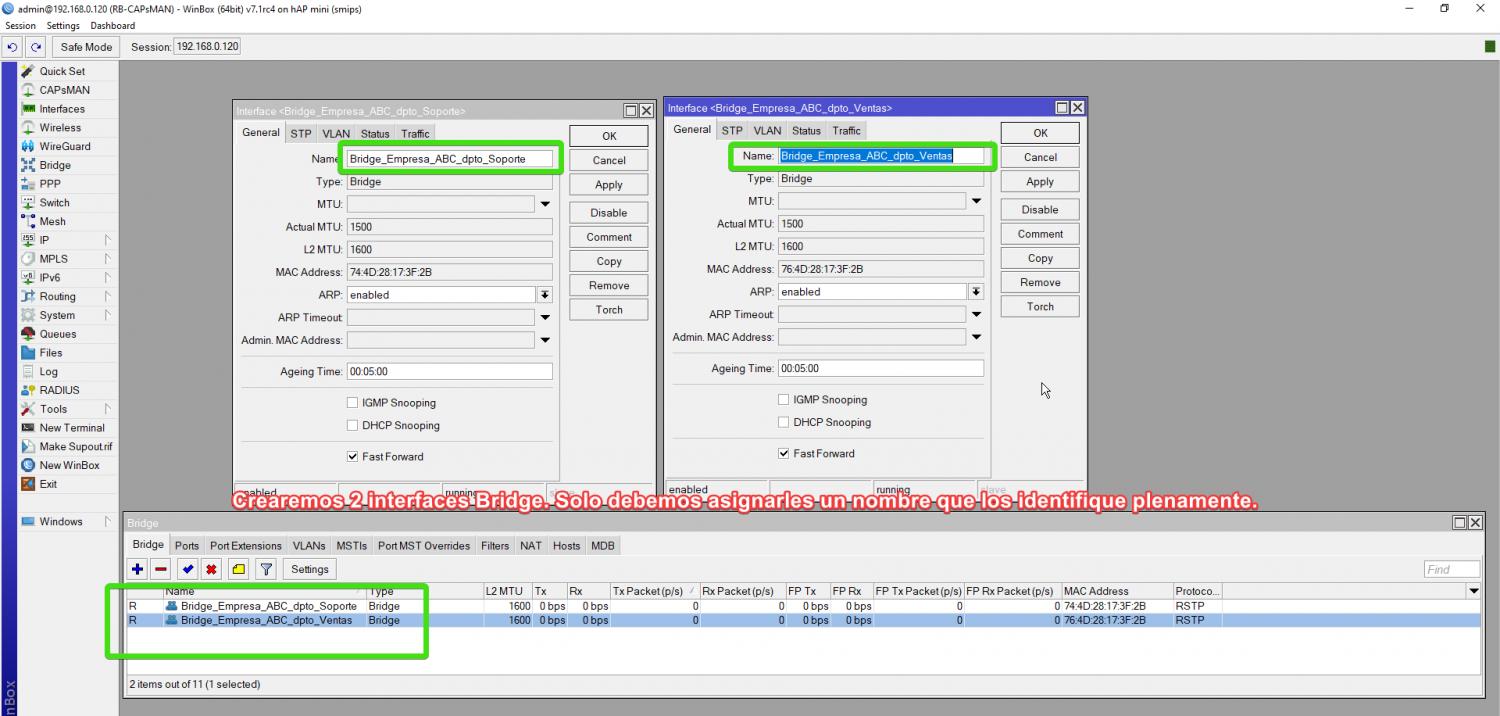Primero debemos crear las interfaces bridge y asignarles una IP según el diagrama.