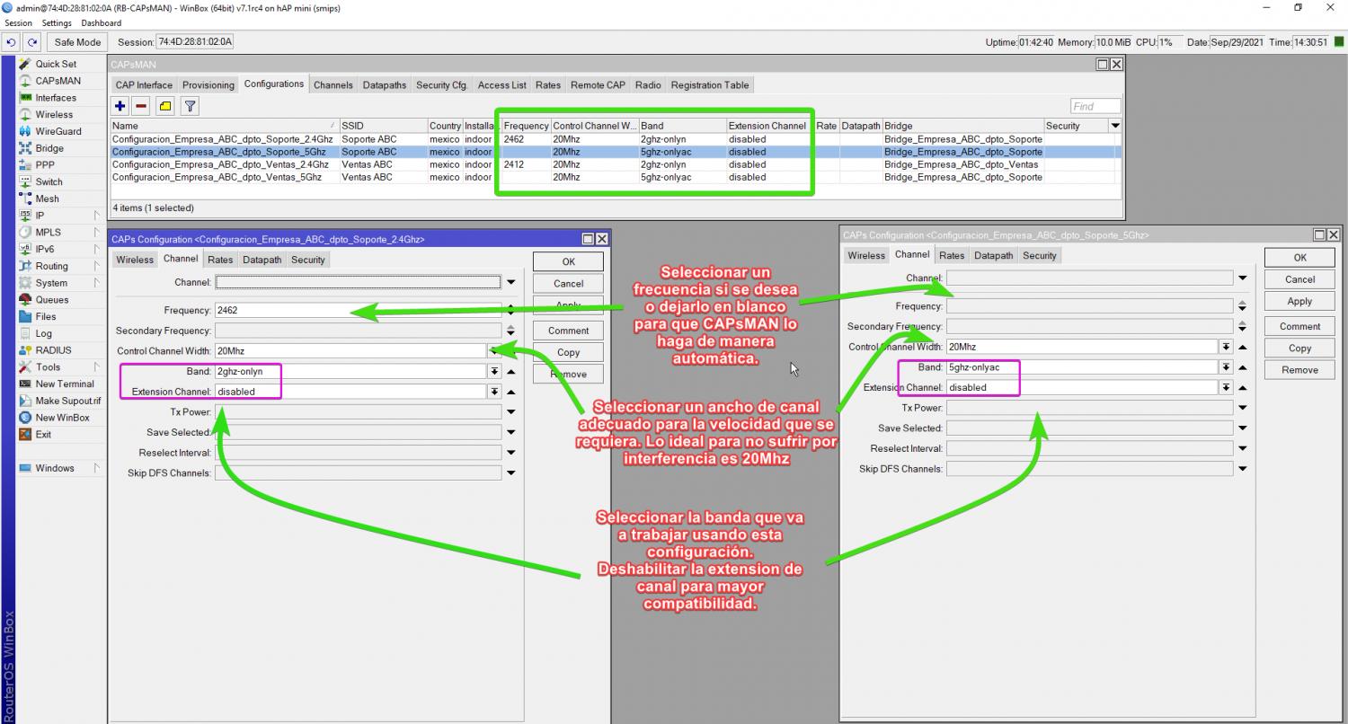 Para este tutorial se crearán 4 configuraciones: ya que tenemos 2 radios en nuestro equipo. Un radio soporta la banda 2.4 Ghz y el otro radio soporta 5Ghz. Pretendemos crear la red Soporte ABC y Ventas ABC. Serán entonces 2 configuraciones distintas para cada radio.