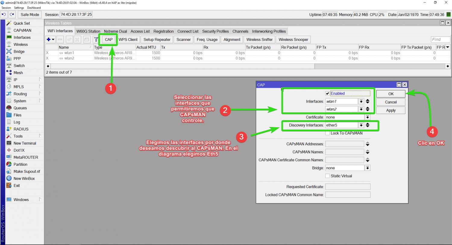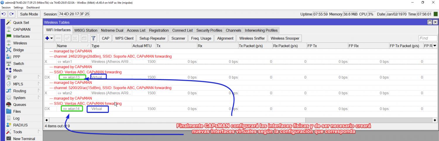 Una vez realizado lo anterior CAPsMAN tomará el control de las interfaces del CAP. Esto puede tomar 1 a 3 minutos.
