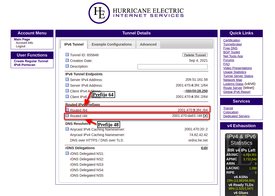 Una vez creado tu tunnel broker, nos darán 2 pool de direcciones ipv6, uno con longitud 64 y otro con 48, para este ejemplo usaremos el segundo.