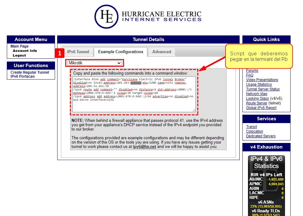Para configurar este pool en nuestro MIkrotik. Nos dirigimos a Example Configuration y seleccionamos Mikrotik, nos dará un script que debemos pegar en la consola de nuestro RB.