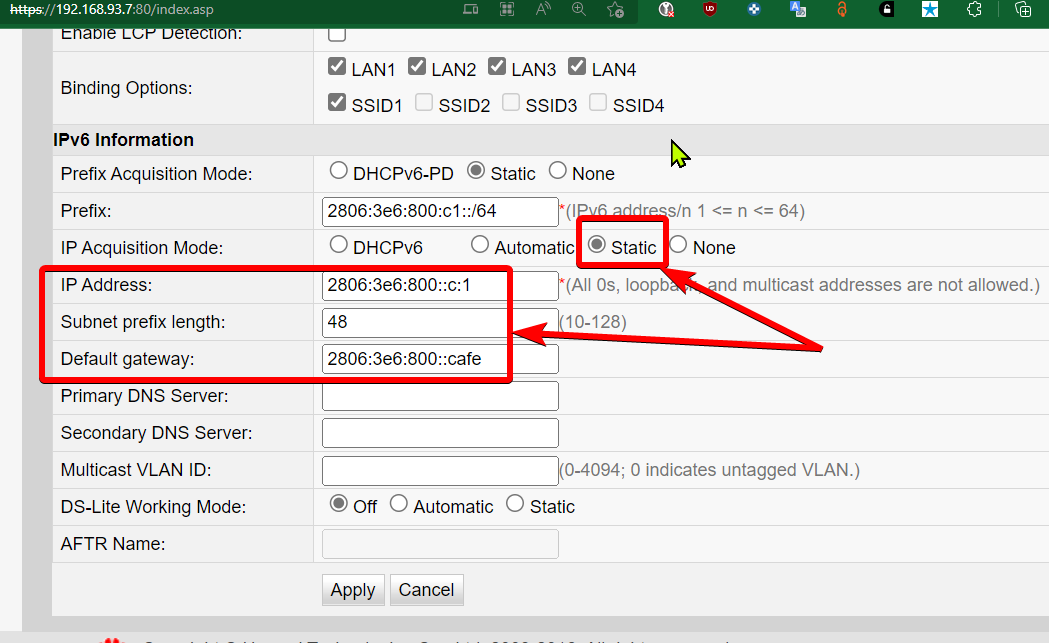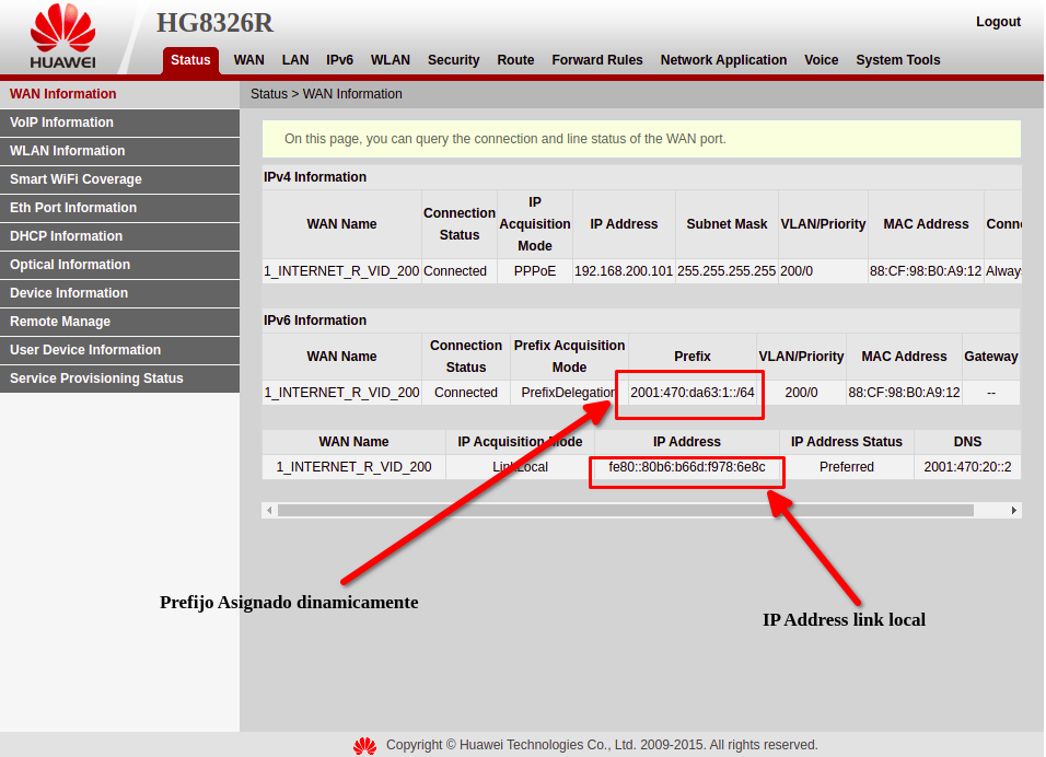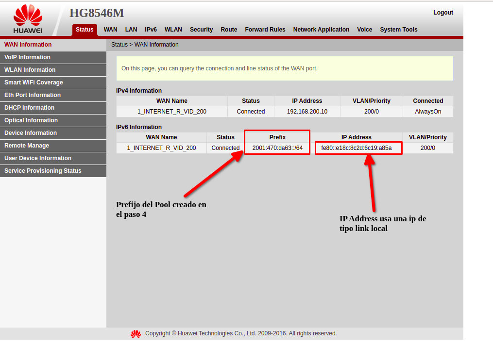 En este ejemplo, el prefijo asignado es el mismo que el prefijo que observamos en la imagen anterior en el status de la WAN de la ONU.