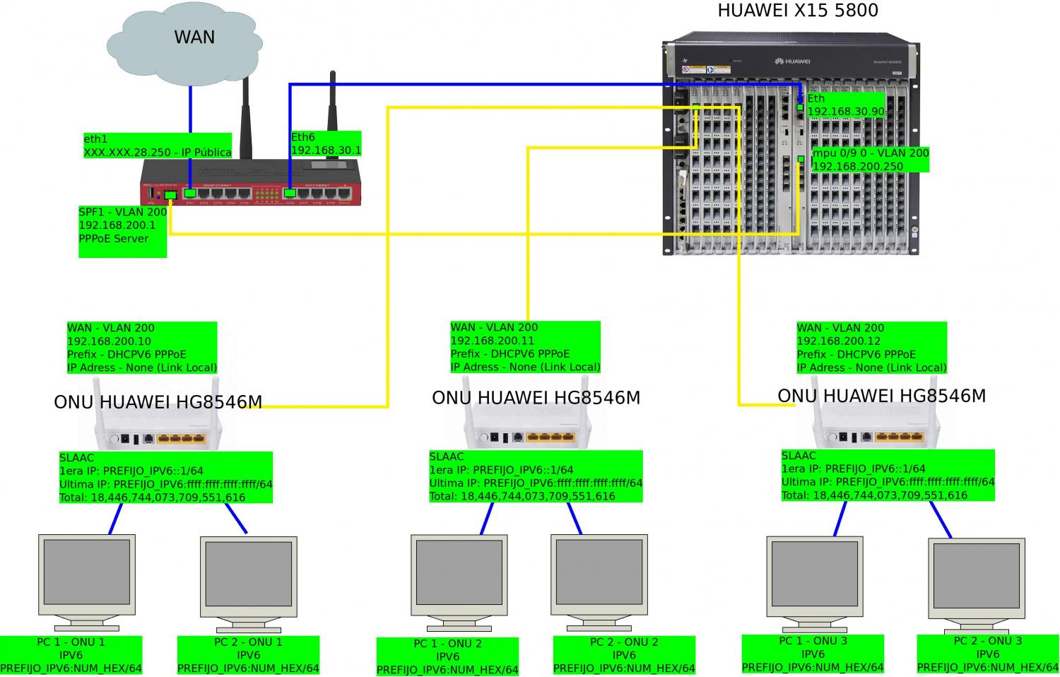 Este manual se enfoca en configurar una conexión entre Mikrotik(RB2011) - OLT HUAWEI X15 5800 - ONU HG 8546, para que este ultimo entregue IPV4 e IPV6 y de esta manera navegar a traves de cualquier protocolo que sea requerido.