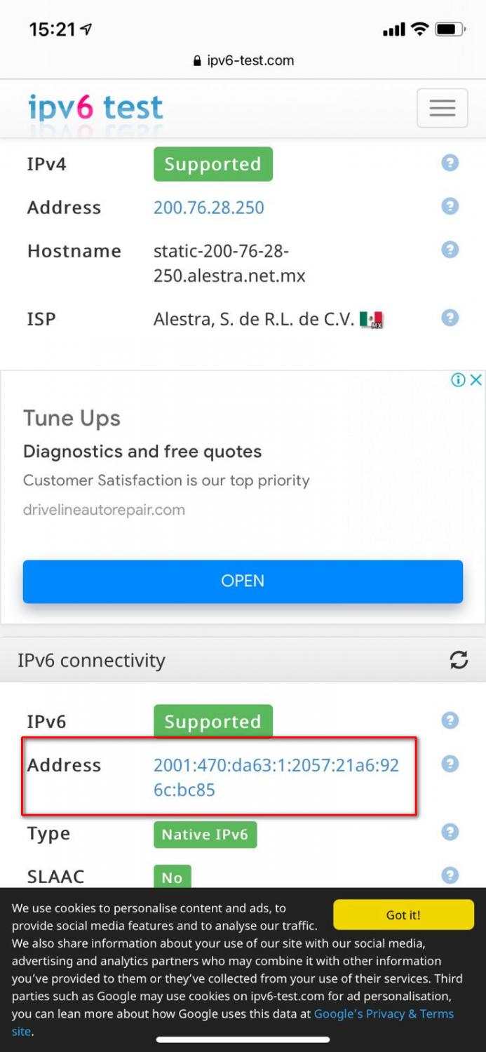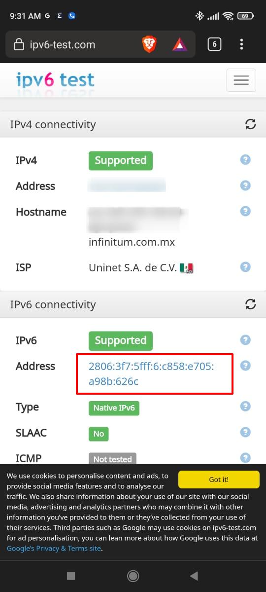 De igual forma, al conectar una onu nos da una ip del mismo prefijo(2001:470:da63::/64) como vemos en la siguiente imagen, el cual es un celular conectado a la onu.