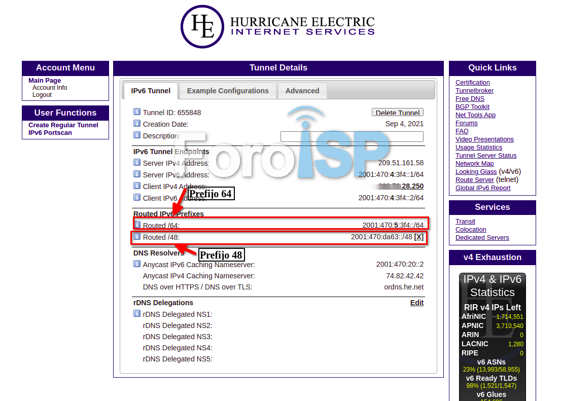 En este caso se obtuvo el prefijo 2001:470:da63::/48 y se subneteará para obtener prefijos 64.