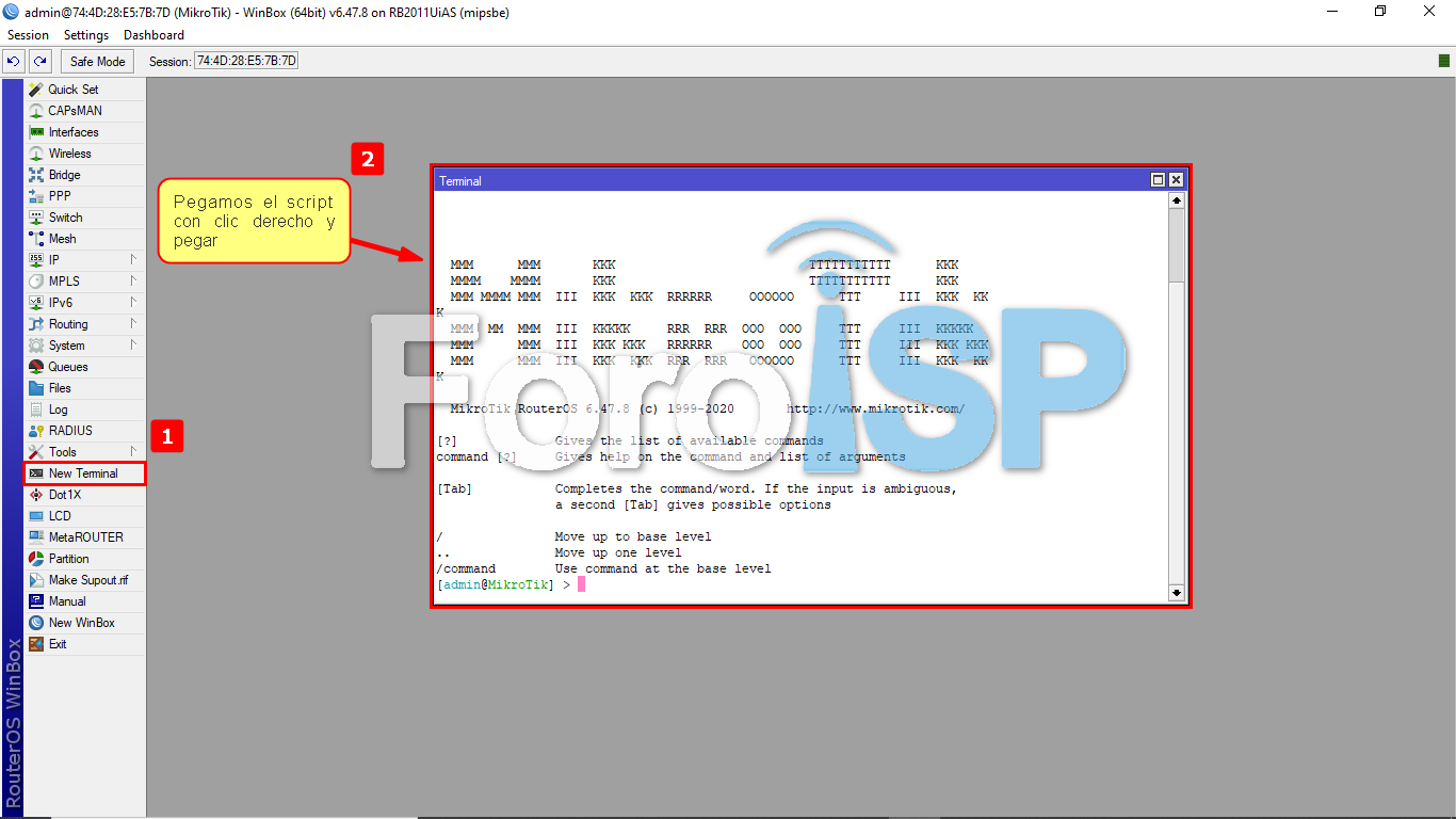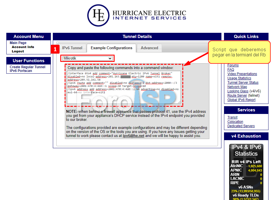 Para configurar este pool en nuestro MIkrotik. Nos dirigimos a Example Configuration y seleccionamos Mikrotik, nos dará un script que debemos pegar en la consola de nuestro RB.