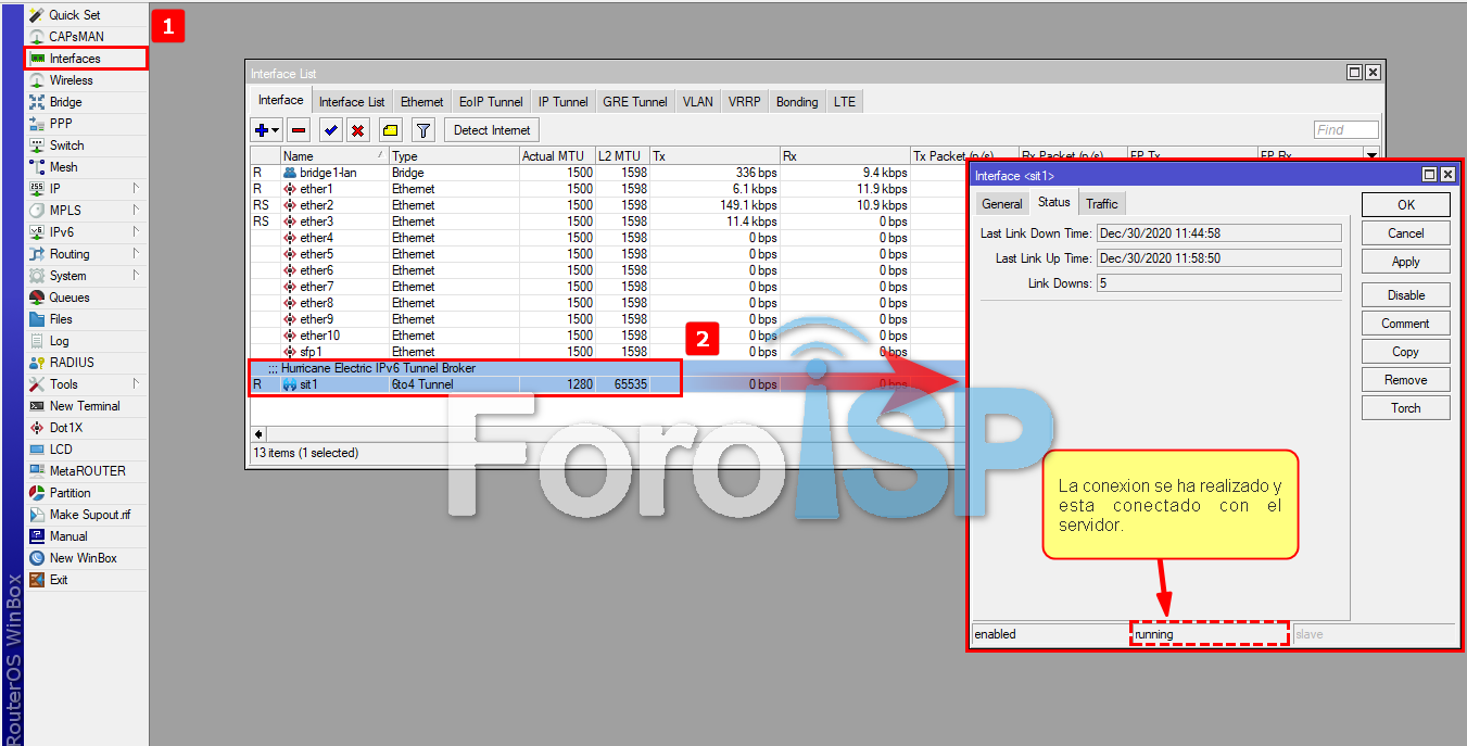 Podemos verificar que se nos creo una interfaz en el RB la cual funciona como tunnel, si no hay ningun inconveniente tendrá el estado de running
