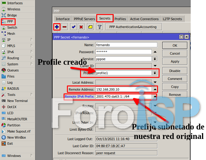 Ahora agregaremos el secret, en este estará el profile creado en el paso anterior y alguna subred del subneteo, para este ejemplo se usará 2001:470:da63:1::/64.
