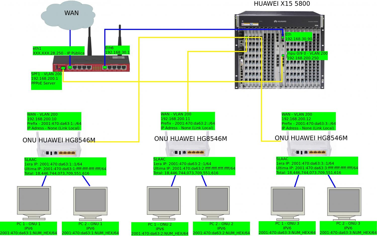 Este manual se enfoca en configurar una conexión entre Mikrotik(RB2011) - OLT HUAWEI X15 5800 - ONU HG 8546, para que este ultimo entregue IPV4 e IPV6 y de esta manera navegar a traves de cualquier protocolo que sea requerido.