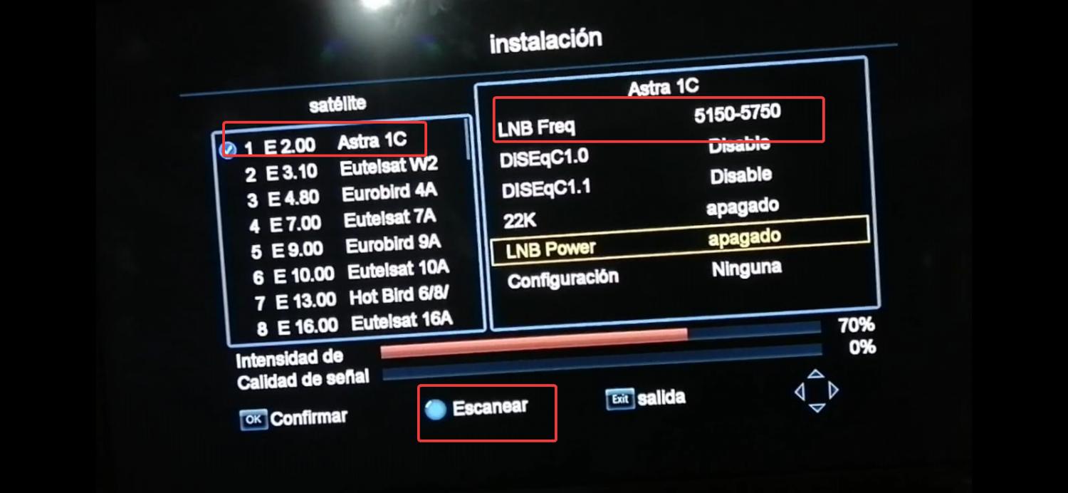 Paso. -2- Seleccionamos un Satélite, luego colocamos la frecuencia 5150 – 5750 para que el satélite escanee todos los canales de esas frecuencias , si el LNB ya tiene voltaje colocamos en ( LNB Power ) en la opción apagado de lo contrario colocamos ( coches ) y ya al final damos en Escanear.