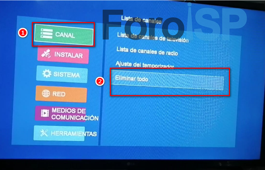 Seleccionamos el botón para menú y seleccionamos la opción de canal , y por ultimo damos en eliminar todo para poder solo dejar un canal en nuestro dispositivo GT Media freesat .