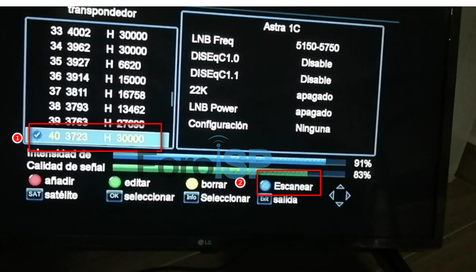 Presionamos el botón SAT en el control para que nos muestre el transponder donde se encuentra nuestro canal para asi poder buscarlo ese parámetro lo encontramos en el paso numero 5 . ya al final después de encontrarlo damos en el botón azul del control que es escanear.