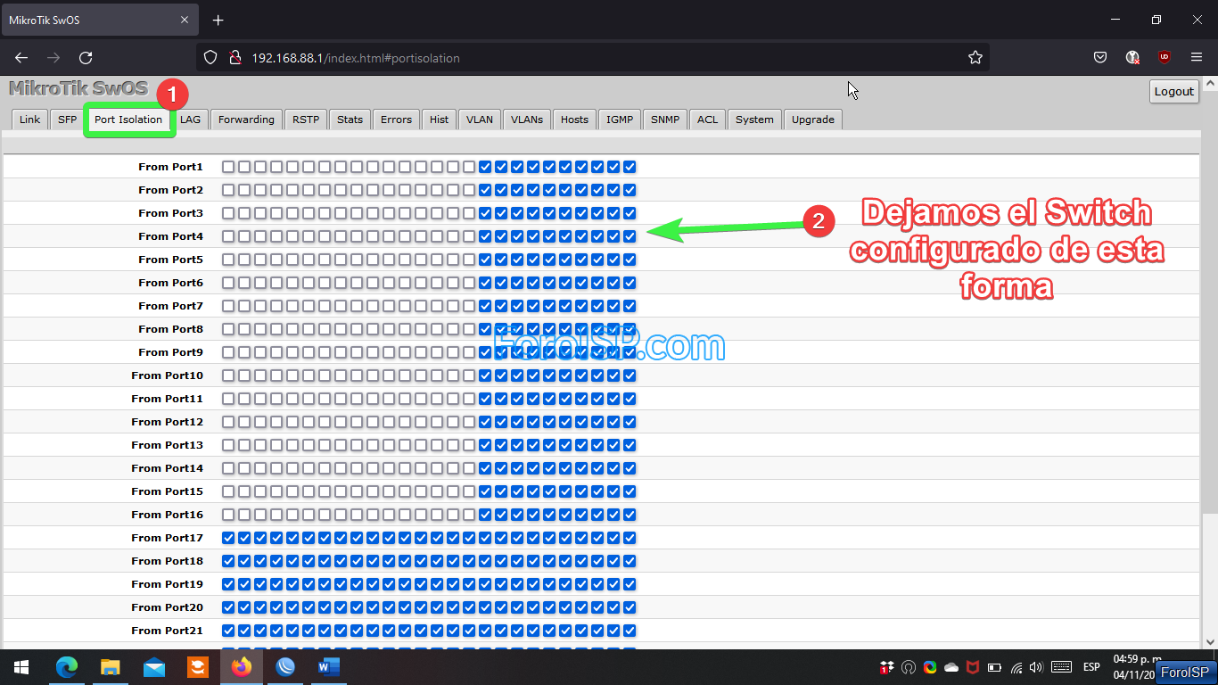 Guardamos los cambios. En este momento el Puerto Ether1 no tiene comunicación con los puertos 2-16 pero del 17 al 24 sí tiene. El puerto 2 no tiene comunicación con el puerto 1 ni del 3 al 16, pero si del 17 en adelante. El puerto 4 no tiene comunicación con los puertos 1,2,3 ni del 5 al 16 pero si al resto.