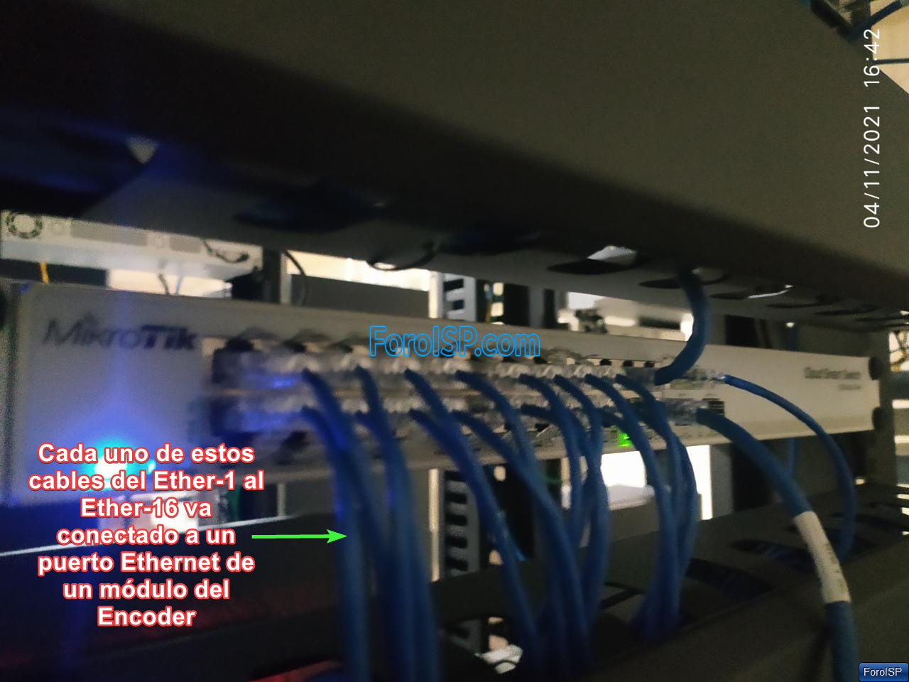 Del Encoder tenemos que cablear todas las interfaces ethernet con cable UTP categoría 6 hacia un swtich mikrotik. No nos sirve categoría 5e ni inferiores. Conectamos el cable del primer módulo del Encoder al primer puerto del switch (Ether1). Hacemos lo mismo con los demás puertos del Encoder y del switch.