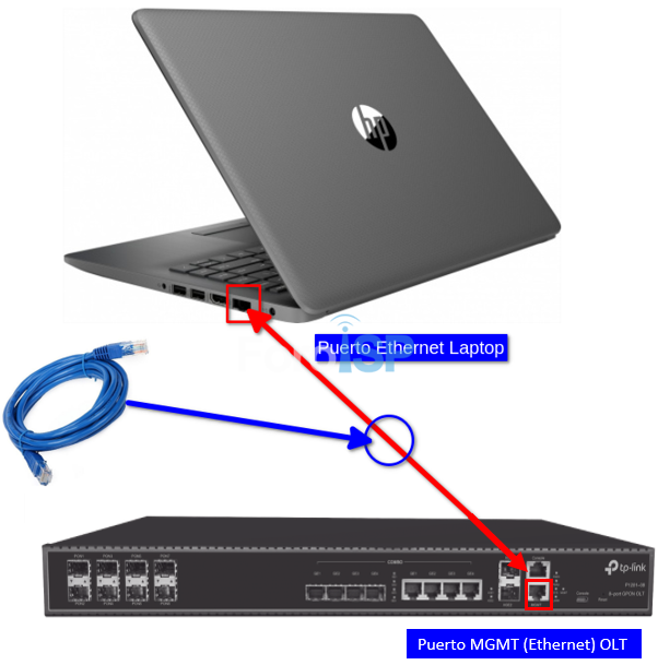 Utilizando un cable UTP del puerto Ethernet de nuestra computadora al puerto MGMT de la OLT, una vez conectados debes asignar una ip estatica (que se encuentre en el rango de la IP de la OLT) a nuestra computadora para por alcanzarla, por ejemplo 192.168.1.10