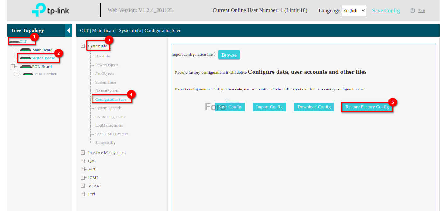 Si necesita restaurar la configuración de la OLT a la configuración de fábrica para realizar este manual, siga los siguientes pasos