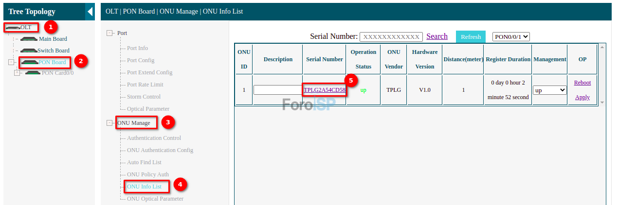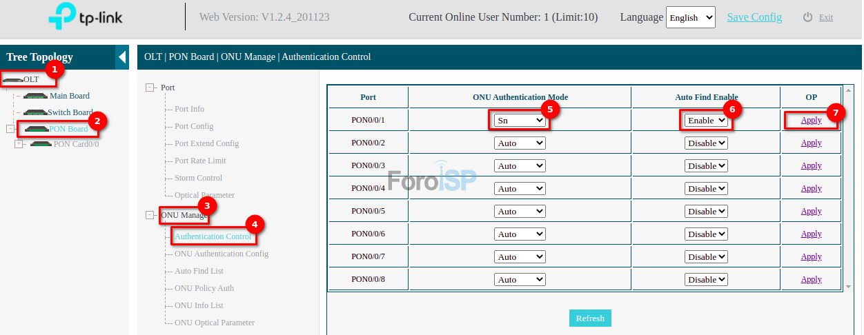 Una vez haya iniciado sesión en la OLT, esta tiene configurado el modo de autorización "Auto" y la función Auto Find "Disable", vamos a editar esta información para el puerto PON correspondiente, en este caso usaremos el 1. Colóquese en: