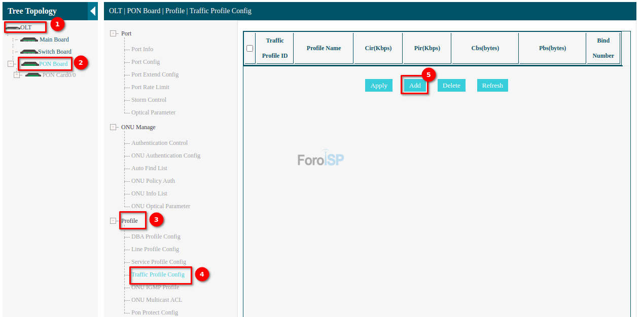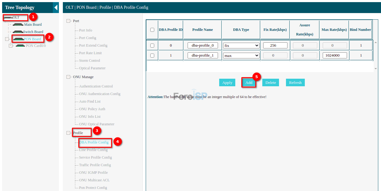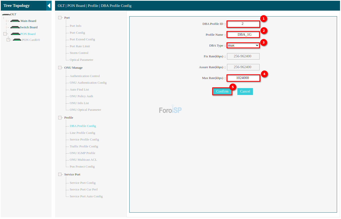 Ahora, es necesario crear un DBA Profile, para este ejemplo será de 1024000 (1G). LA OLT cuenta ya con 2 DBA Profile así que la OLT nos colocara el ID 2. Colóquese en: