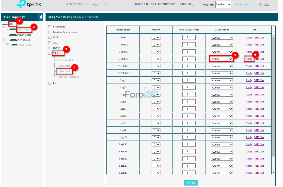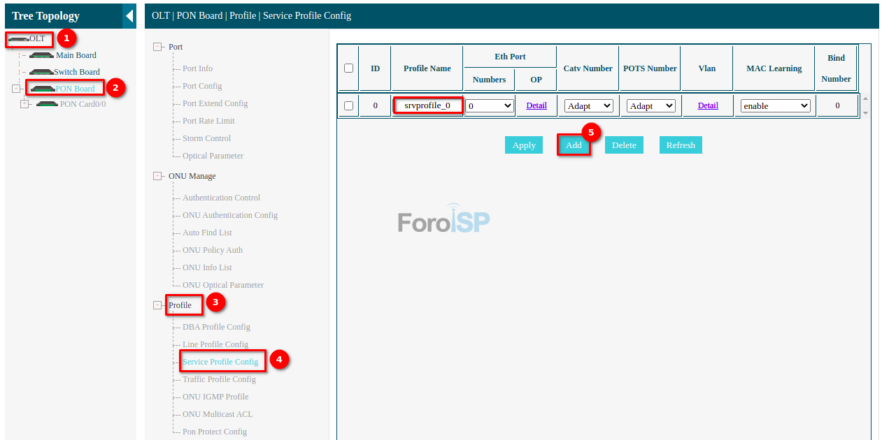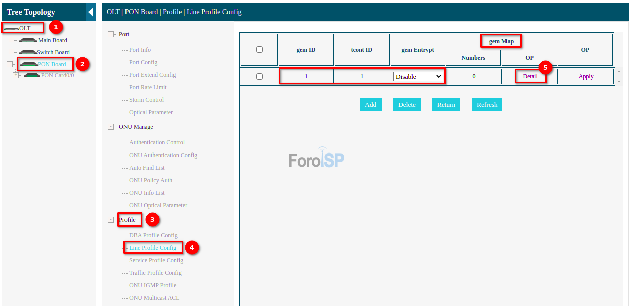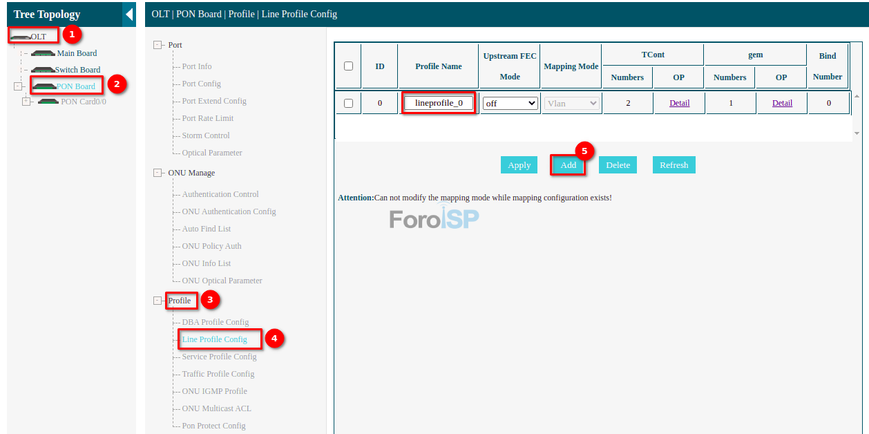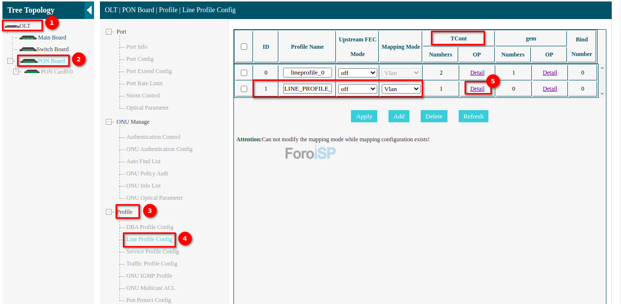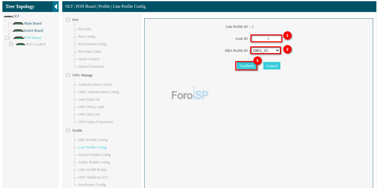 La OLT ya cuenta con un Line Profile creado, así que nosotros usaremos el ID 1. Colóquese en: