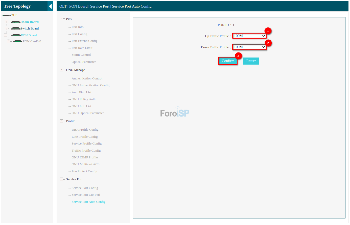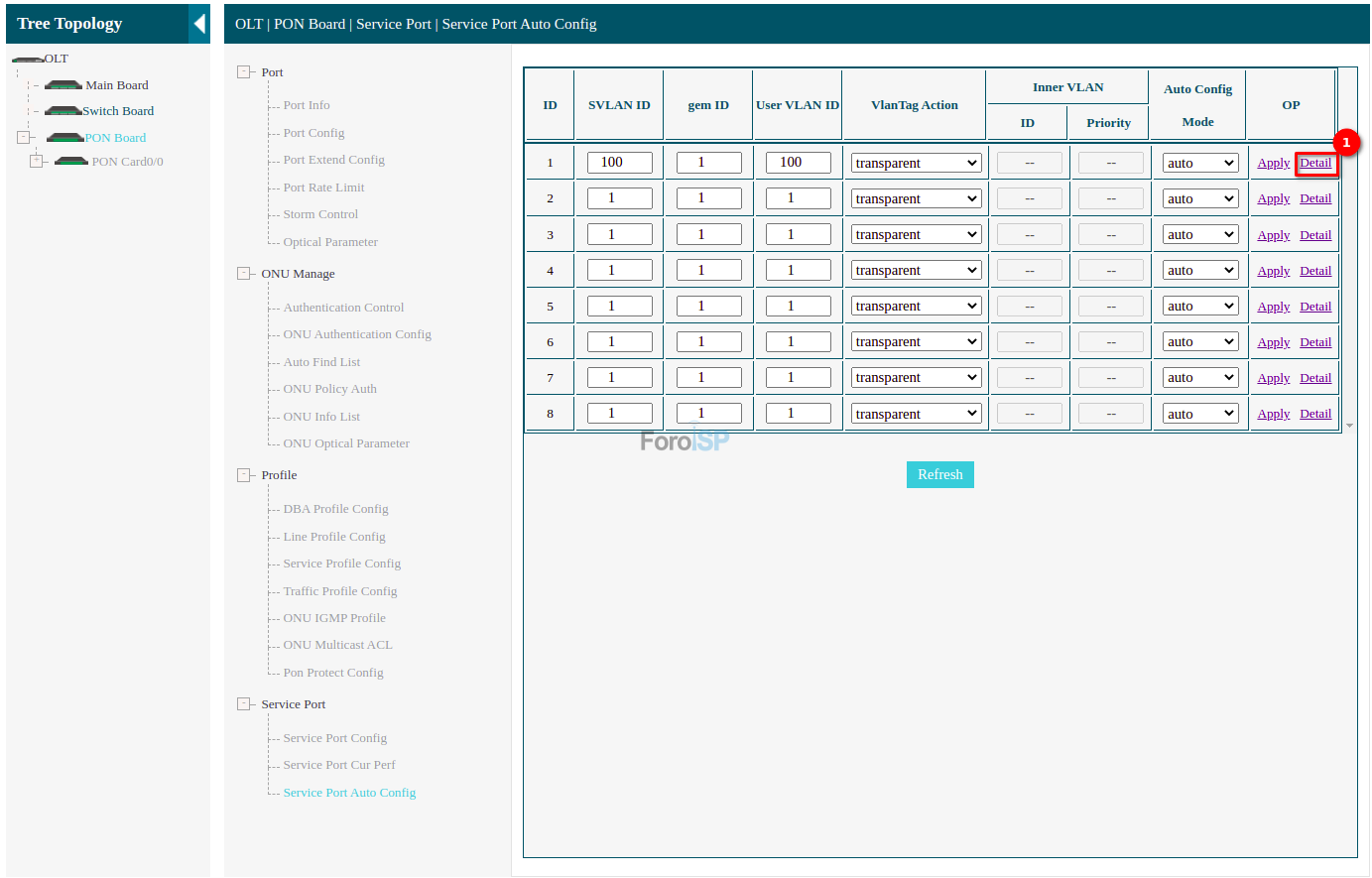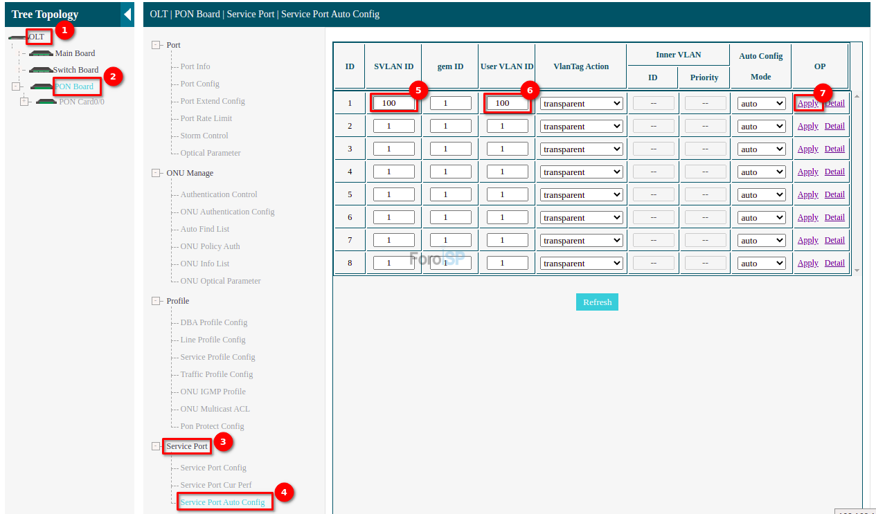 Como paso final cree la configuración de Service Port Auto donde agregara la VLAN recién creada a las columnas SVLAN ID y User VLAN ID. Esto se hace porque la OLT agrega automáticamente un Service Port a cualquier ONU al momento de autorizarla, si desea modificar la información de ese Service Port, entonces colóquese en: