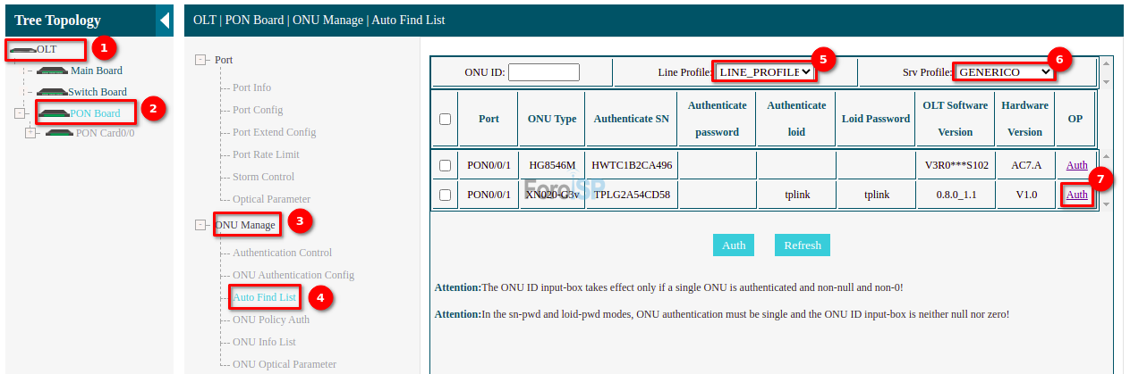 En la lista de Onus para autorizar, antes debe seleccionar el Line Profile y el Service Profile que se le agregara a la ONU. Colóquese en: