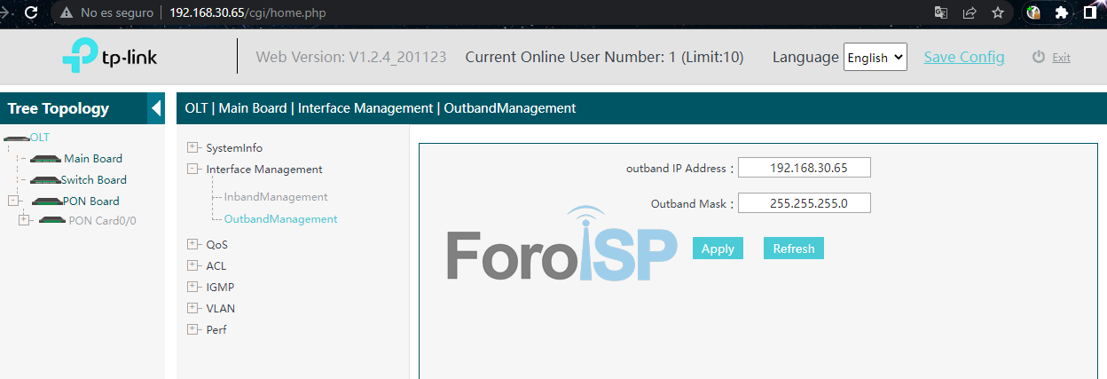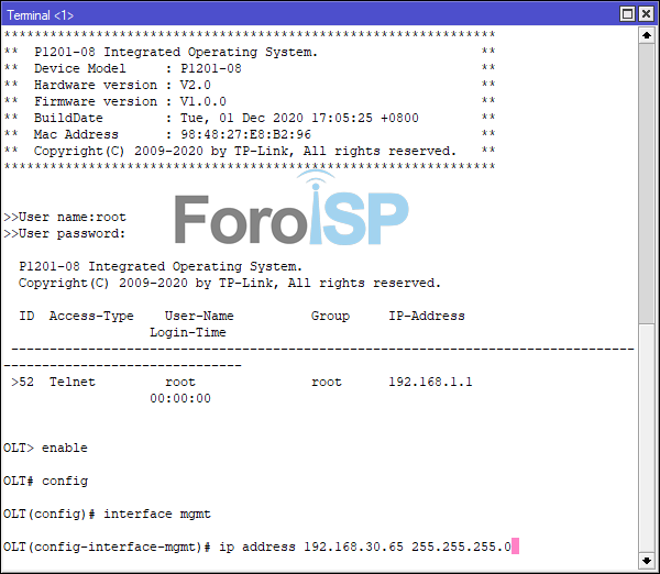 Ahora si accedemos a la OLT con la nueva ip podemos ver que la ip se coloco tal y como realizamos.