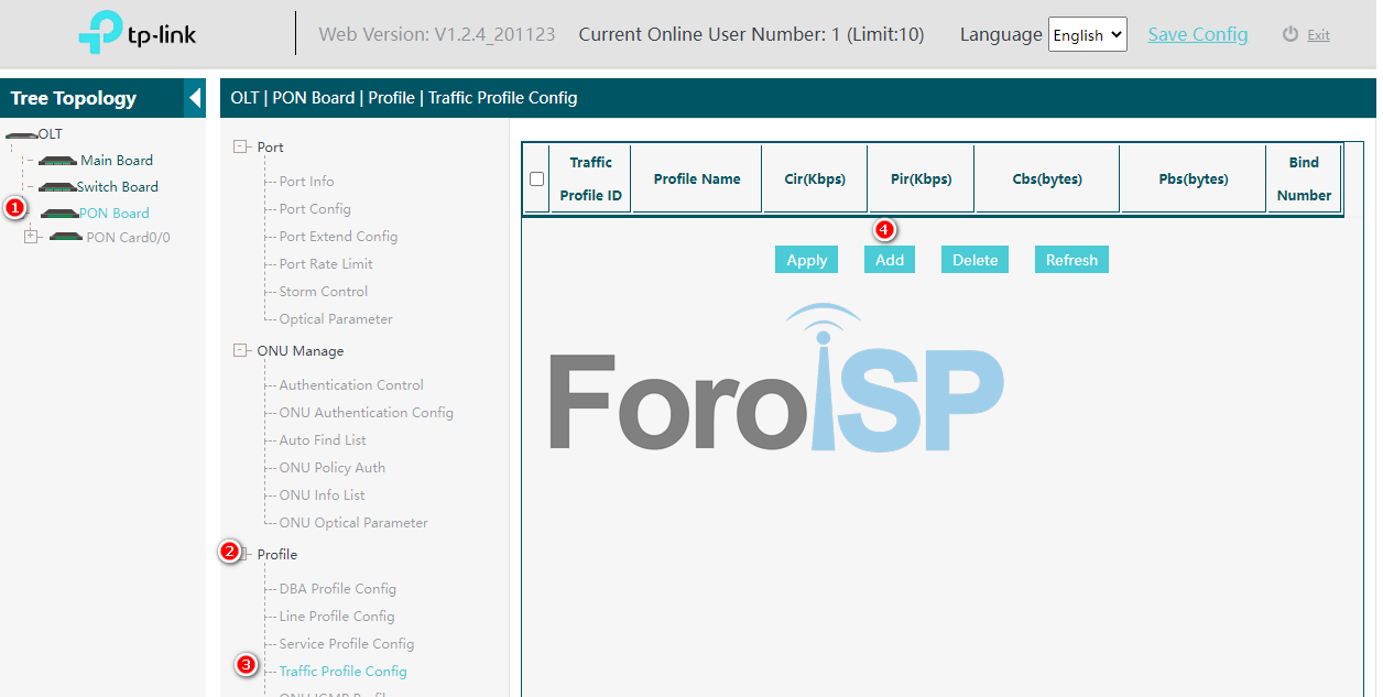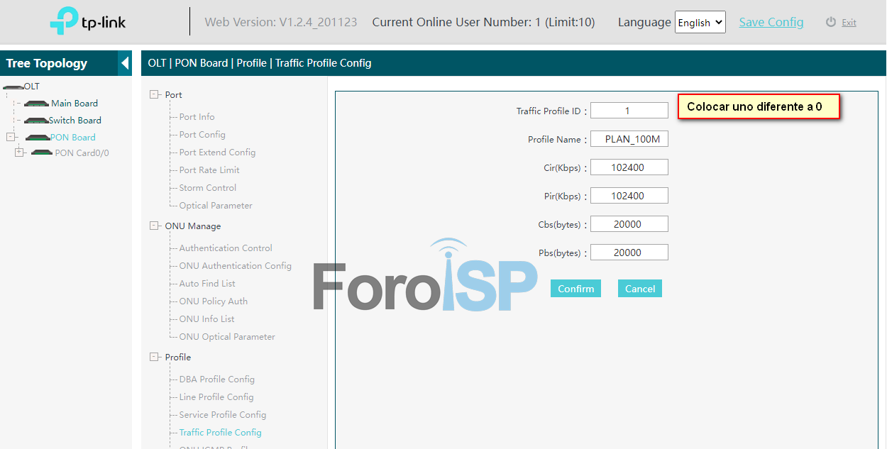 Luego de ello podemos colocar el Traffic Profile con el que queremos que las Onus se autentiquen de forma automática. Nos dirigimos a PON Board y en la sección Profile seleccionaremos la opción Traffic Profile Config. Para este ejemplo, vamos a crear un traffic profile de 100 Megas.