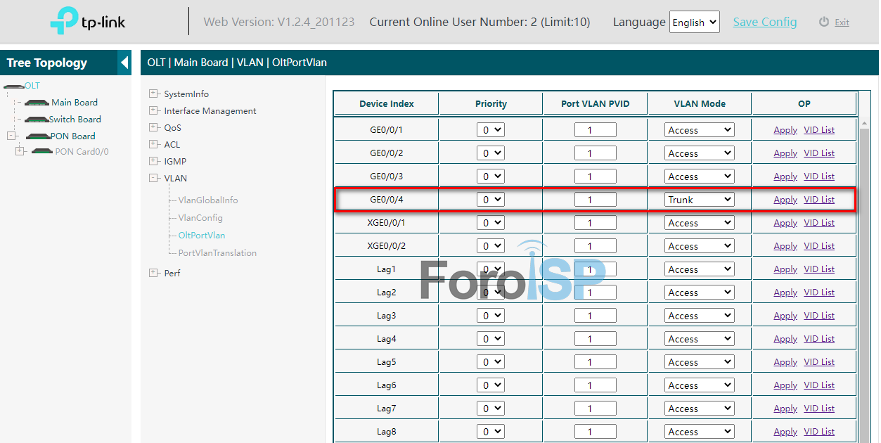 Crearemos una VLAN por donde pasara el servicio de los clientes. Como primer punto colocaremos el puerto Uplink en el modo Trunk para poder taggear VLANs en el apartado OltPortVlan.