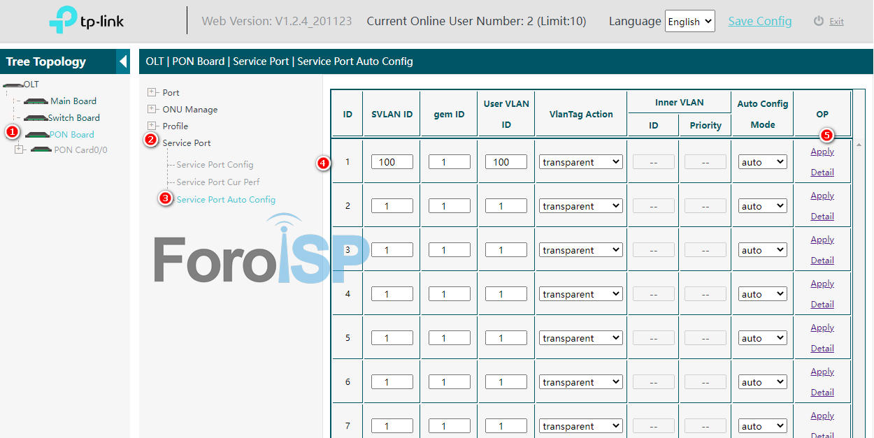 Tenemos que colocar que para el Service Port se coloque de forma automática nuestra VLAN de servicio, por eso nos dirigimos al apartado Service Port Auto Config vamos a introducir que la SVLAN y User VLAN sera la 100 y el modo sera Transparent.