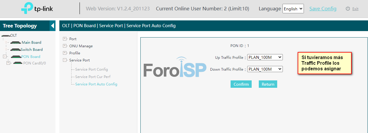 Adicionalmente, al darle Detail podemos colocar el Traffic Profile con el que las onus de ese puerto se autenticaran de manera automática.