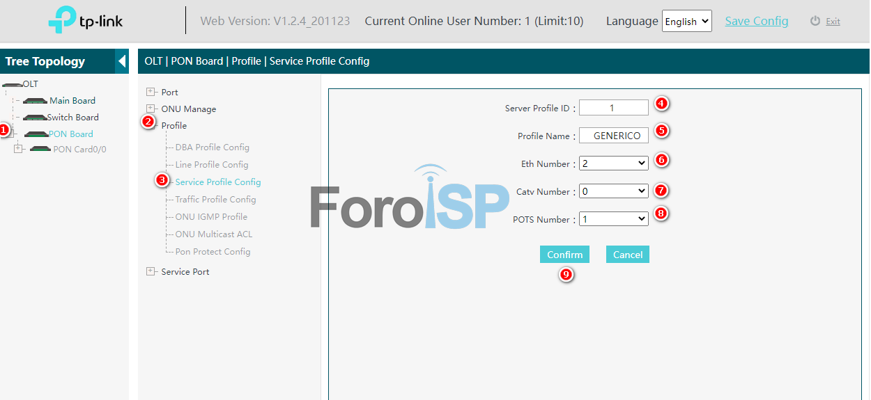 Agregaremos el service profile para las onus que se autoricen con el id 1 porque ya existe uno por default. Podemos especificar la cantidad de puertos Ethernet, POTs y CATV si es que lo tiene.