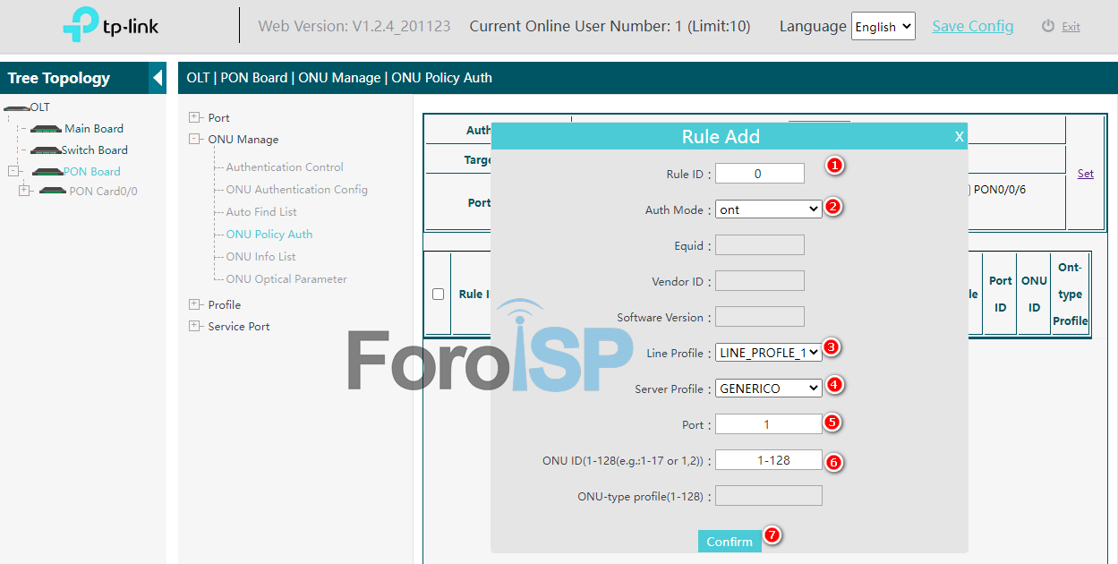 Llenamos el formulario en donde colocamos el line profile y DBA que creamos. La regla puede tener id 0 y el modo de autenticación colocaremos ont. Es importante colocar el puerto PON en el que conectaremos las onus y los onu-id, en este caso podemos poner todo el rango hasta el 128.