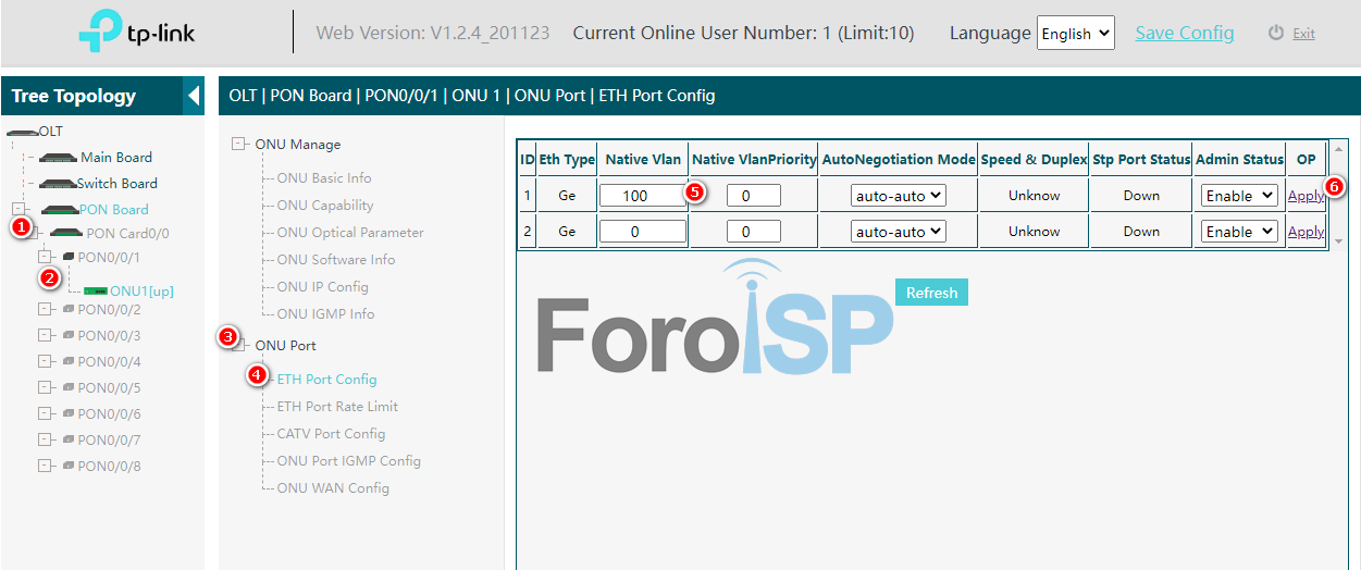 Una vez autenticada, debemos ir a ETH Port Config colocar el puerto ETH sobre la VLAN Native para que pase el servicio de la VLAN 100.