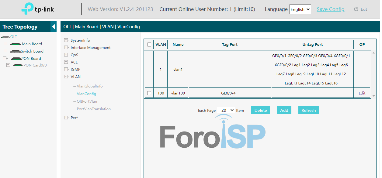 En VlanConfig vamos a crear la VLAN 100 y le vamos hacer tag en la interfaz GE 4.