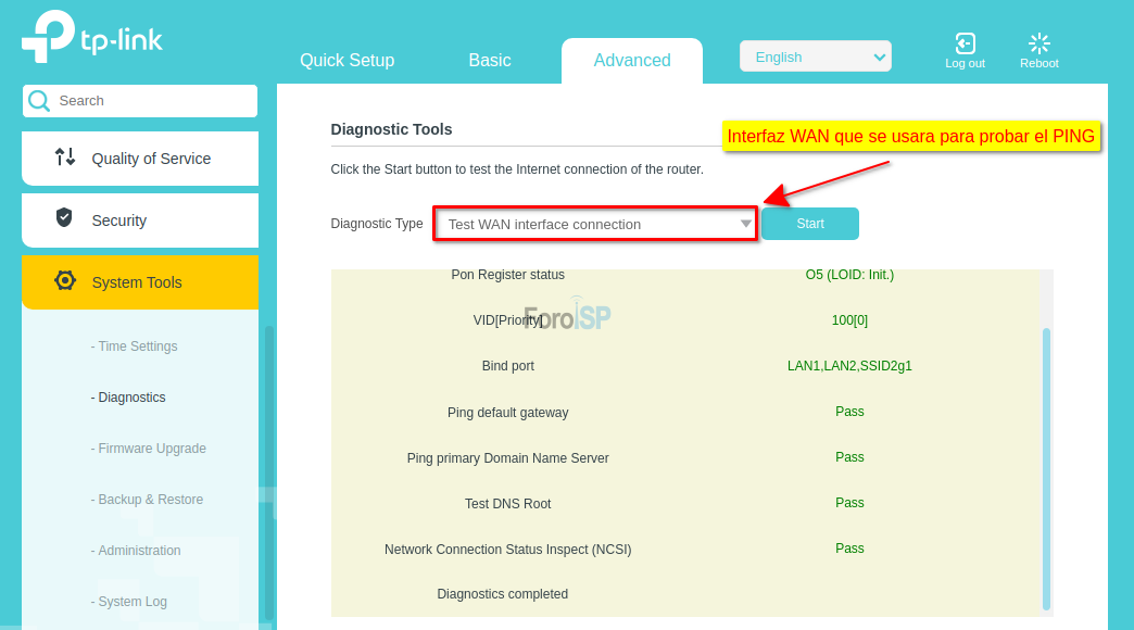 Una vez creada la Wan IP, la probamos realizando un ping desde la ONU a INTERNET.