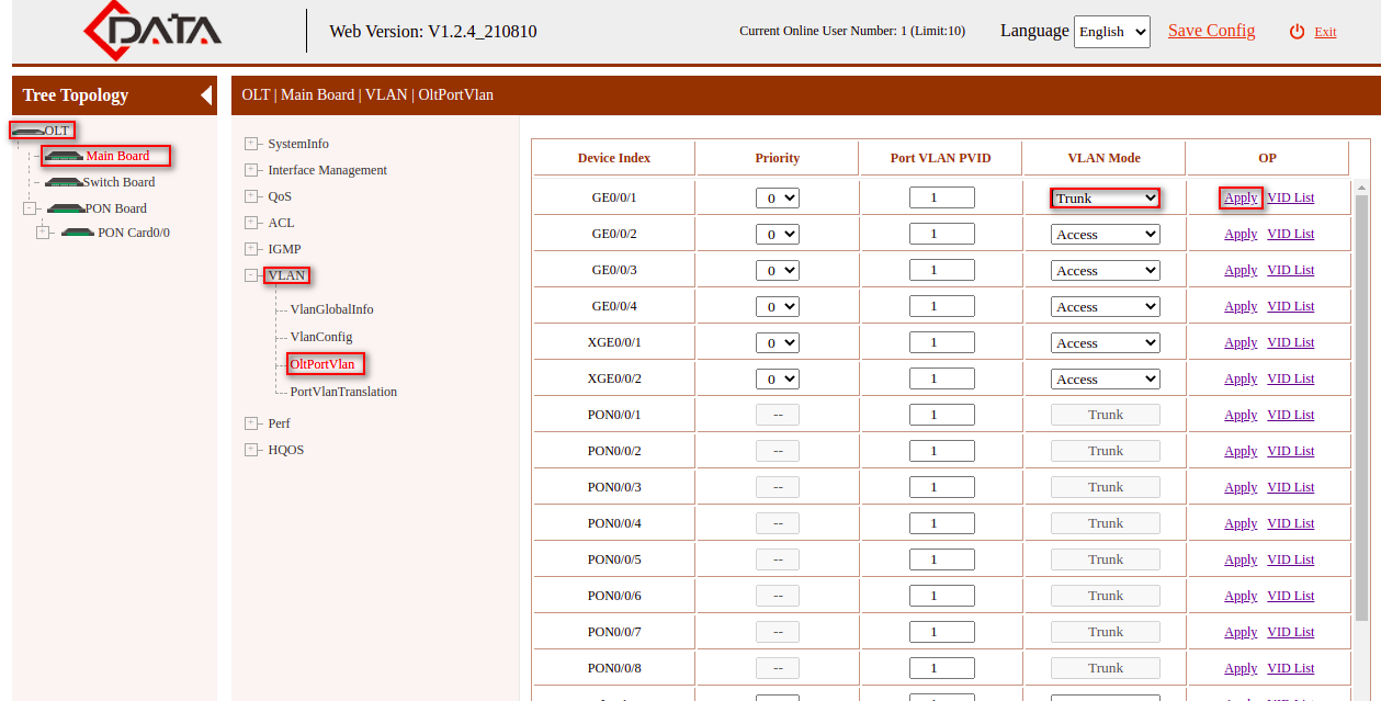 OLT | Main Board | VLAN | VlanConfig