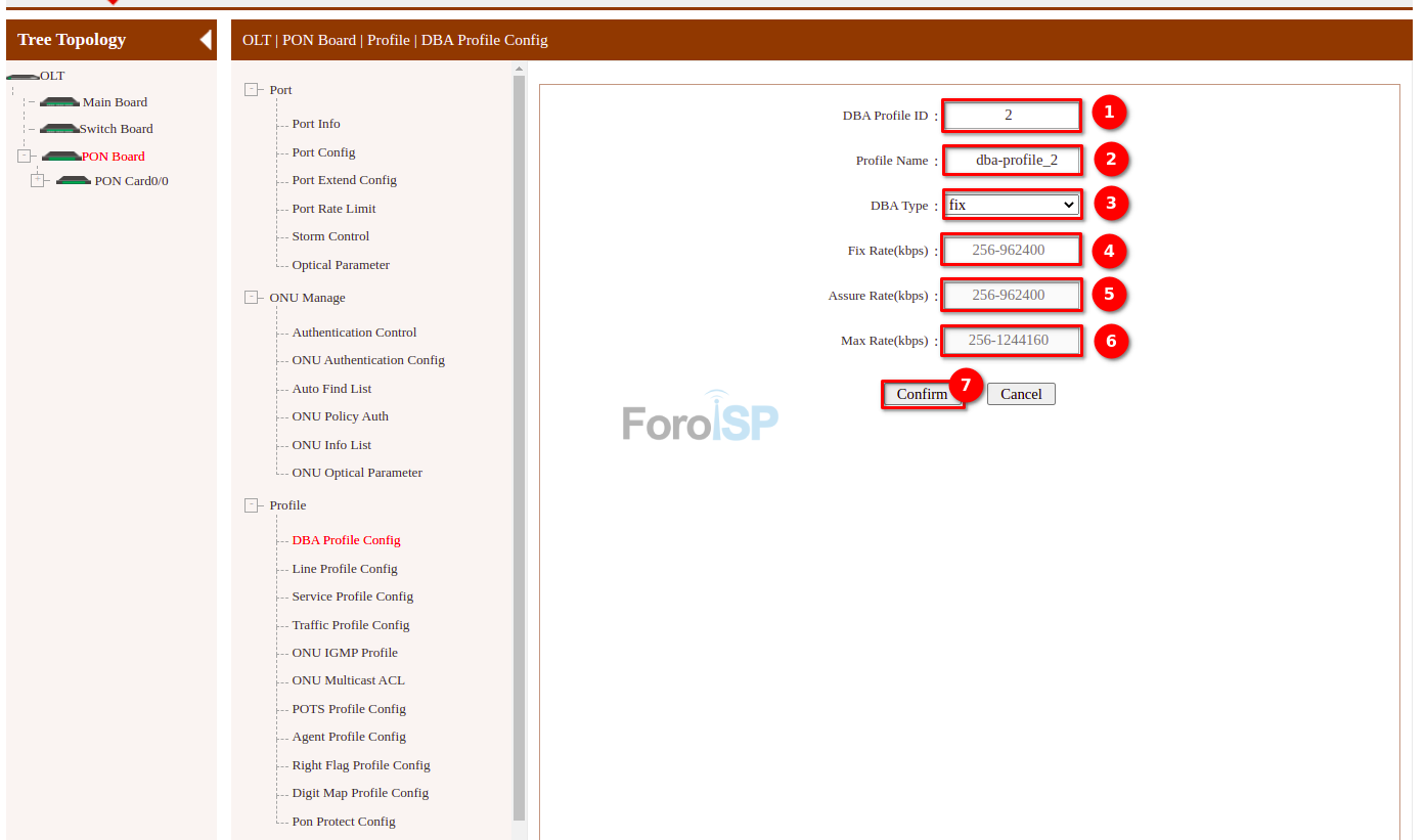 El DBA Profile ( Dynamic Bandwidth Assingment ) especifica o controla el trafico ascendente (upstream desde la ONU). Normalmente todavía necesitamos configurar el upstream y downstream porque el control del perfil DBA solo modifica el upstream de la ONU, lo que significa que no hay limitación en el downstream.