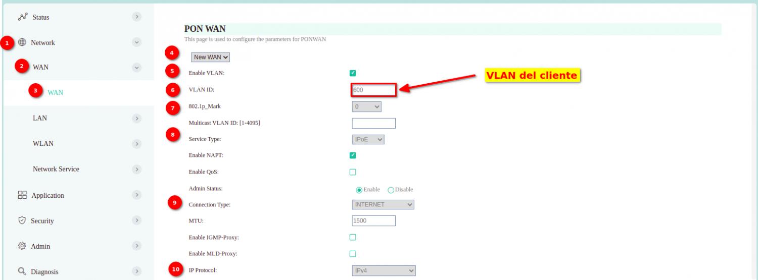 Si la información ingresada es correcta, podremos acceder a la Interfaz de la ONU. En el menú de opciones, nos colocamos en Network | WAN | WAN y agregamos un nuevo registro