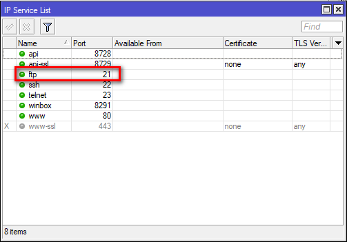 Como dijimos anteriormente, usaremos un routerboard Mikrotik como nuestro servidor local FTP, por eso en IP Service debemos asegurarnos de que este habilitado el puerto 21.