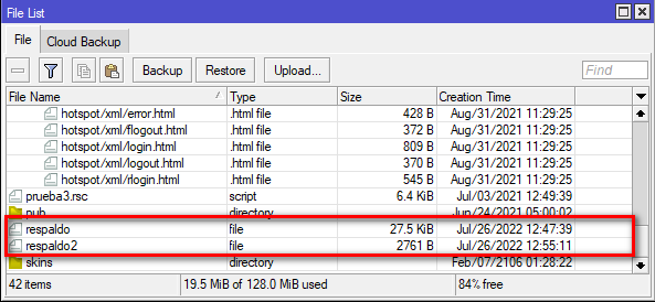 Una vez realizado el proceso, podemos validar la creación de estos backups en el servidor local FTP. Únicamente debemos ver el apartado de File del Mikrotik y validar los archivos que acabamos de crear.