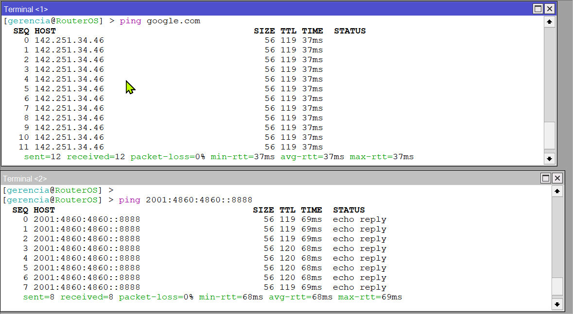 Una vez configuradas nuestras interfaces con las IPs correspondientes debemos probar que tenemos salida hacia internet tanto en IPv4 como en IPv6.