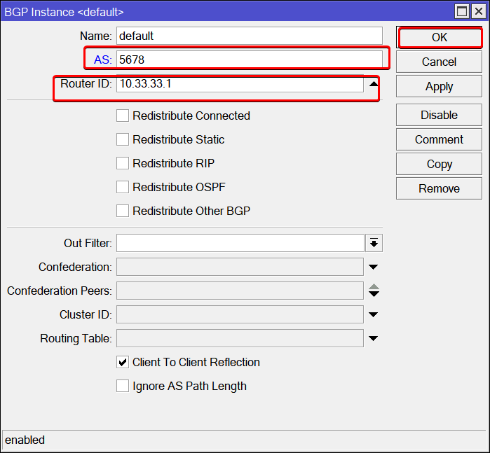 Habiendo validado esto, procedemos a configurar nuestra instancia BGP. En Routing>BGP vamos a la instancia por default. Tenemos que colocar nuestro Número de Sistema Autónomo y como Router ID usaremos la IP de nuestra interface Loopback. Dejamos el resto de opciones por defecto.